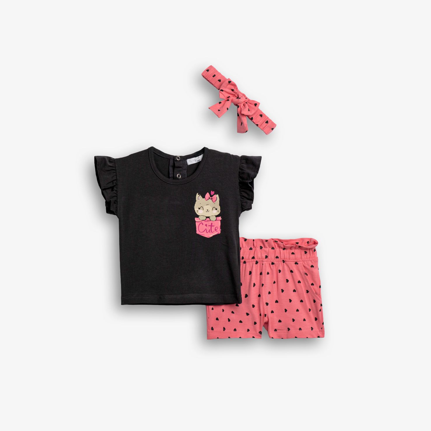 Set blouse jersey lycra with printing (cat) and shorts with printing allover and headband in color anthracite/crayon rouge for girls months