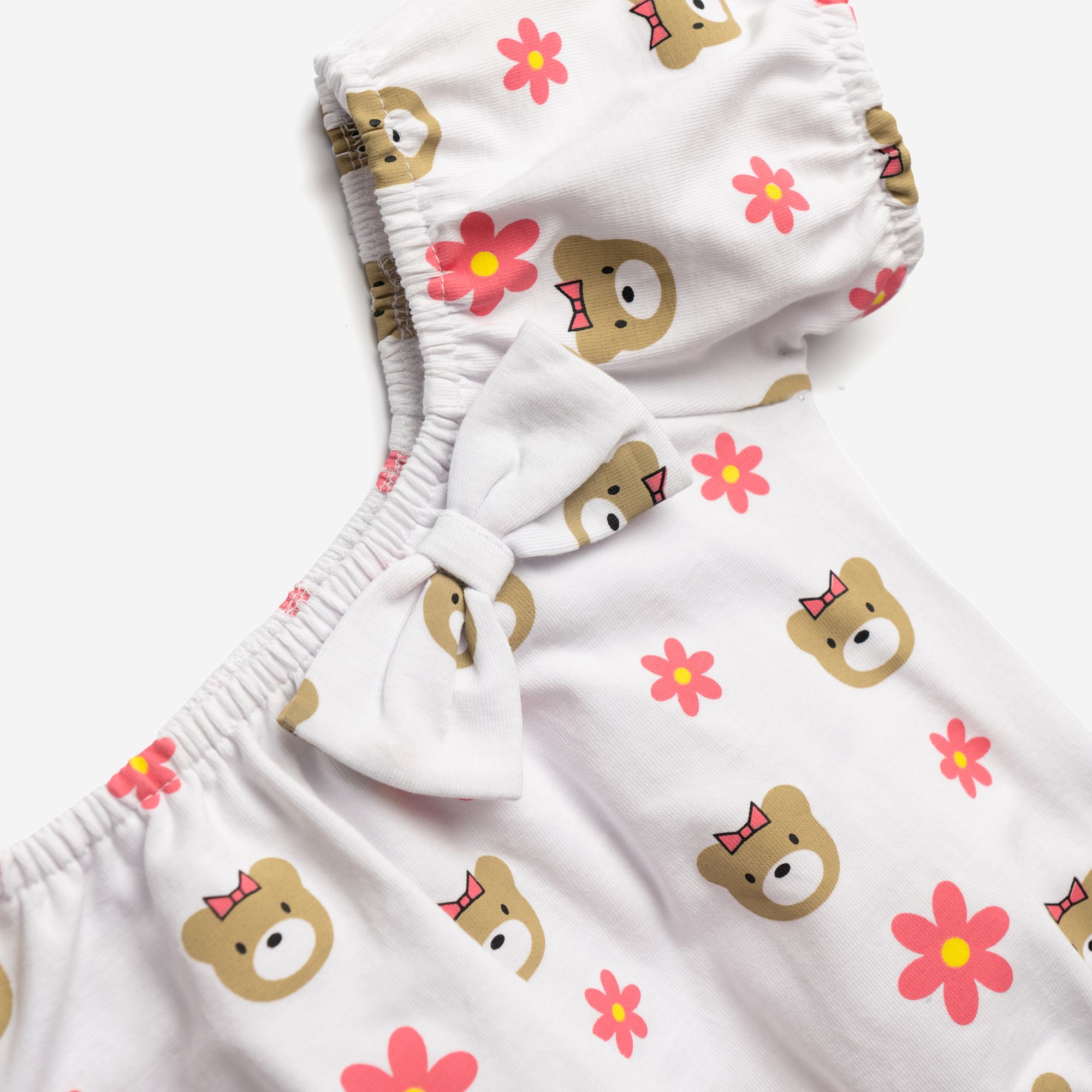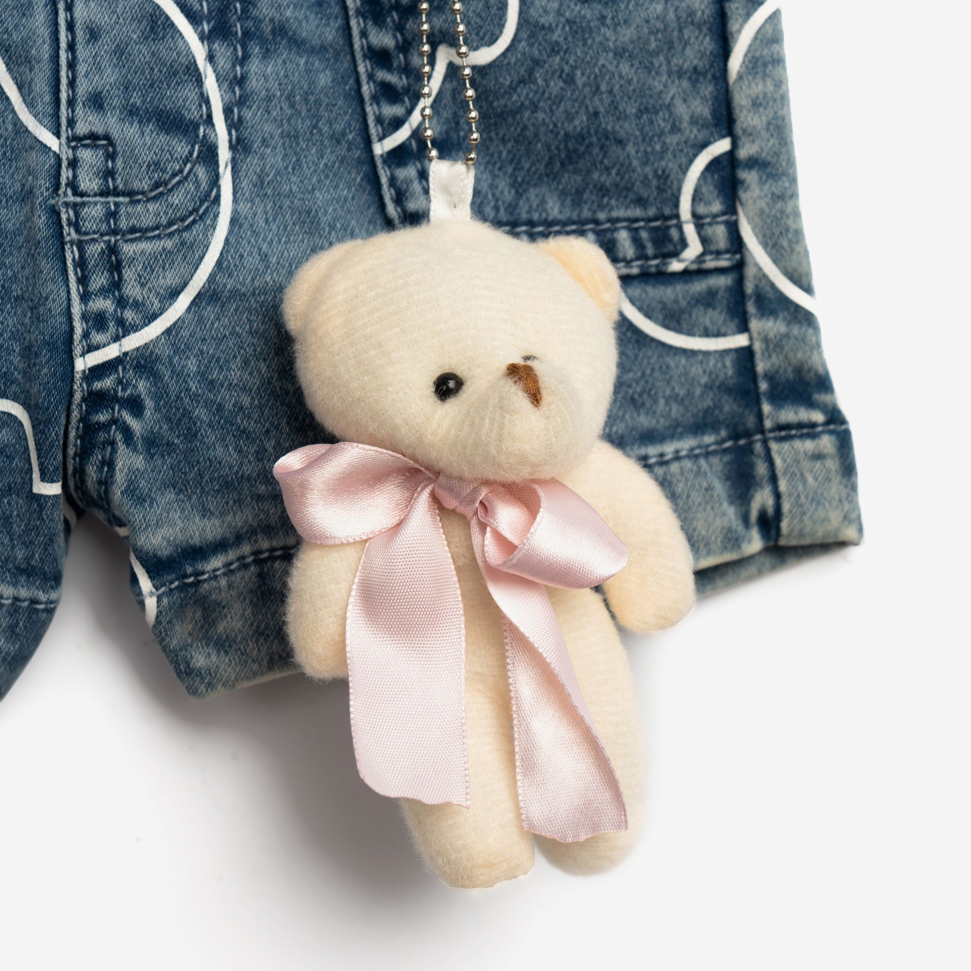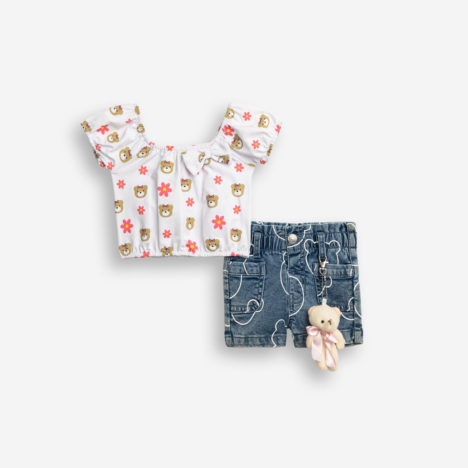 Set blouse jersey lycra with printing (teddy bear) allover and shorts jean lycra with printing allover in color white/blue jean for girls months