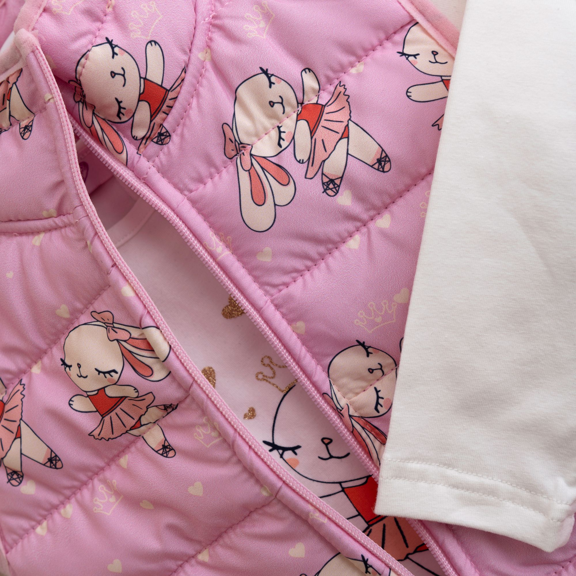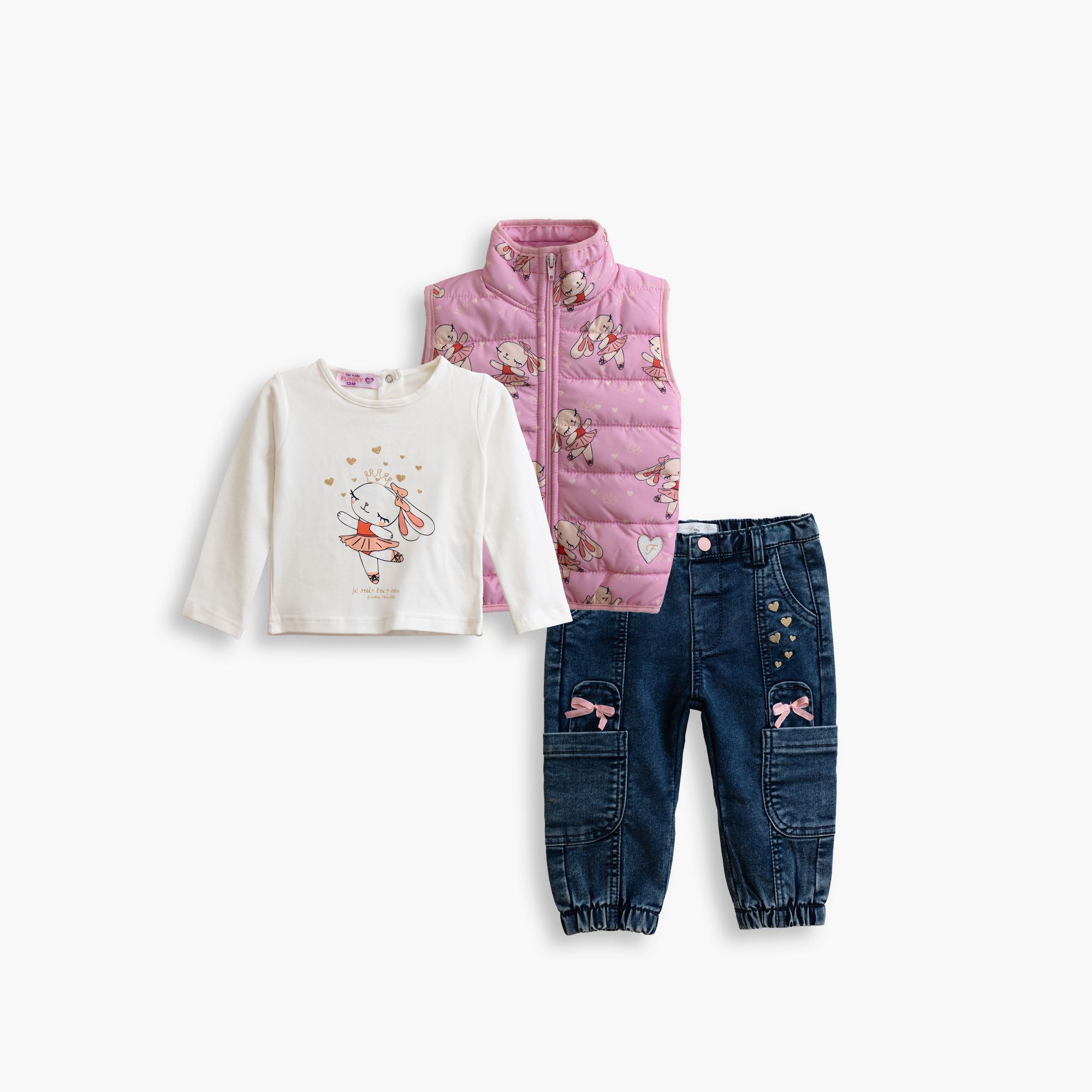 Set 3 pcs jacket sleeveless with printing (bunnies) allover and blouse long-sleeved jersey lycra with printing and pants jean lycra in color mystirose/ecru/jean for girls months
